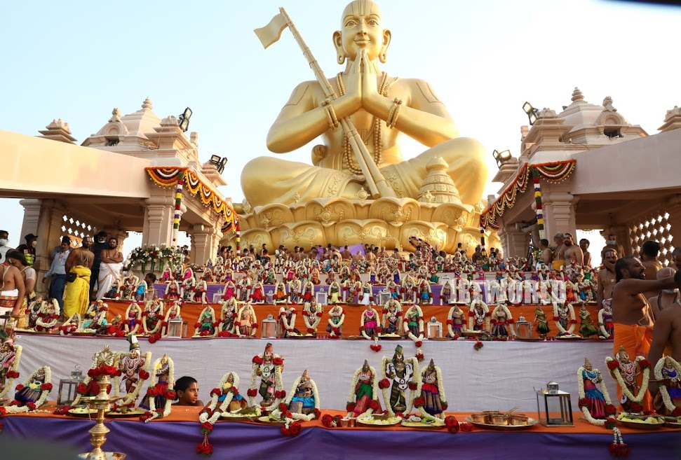 Dedicating Ramanujacharya (now appearing as the Statue of Equality) to the world, the divine union of the 108 divya desa (inspiration centres where chosen souls experienced Him, sang His glory and thus revealed the truths of existence) mu:rthis was celebrated in the presence of thousands of devotees and lakhs of online viewer devotees..