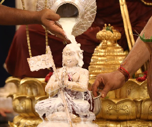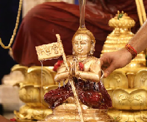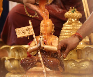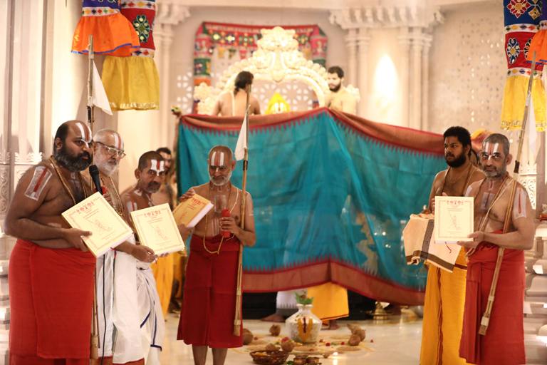 In the morning, thirumanjana seva (an opportunity to serve Ramanujacharya’s divine deity form, the Swarna Ramanuja using water, sandalwood, turmeric, thulasi, milk, honey etc)